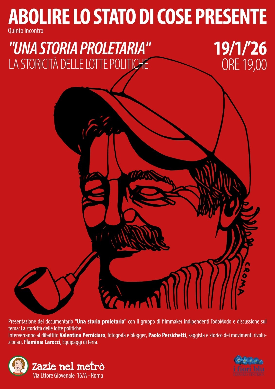 Lunedì 19 dicembre ore 19 da Zazie nel metrò. Per la rassegna "Abolire lo stato di cose presente". Discussione sul tema La storicità delle lotte politiche a partire dal documentario "Una storia proletaria" realizzato dal gruppo di filmmaker indipendenti TodoModo. Interverranno al dibattito Valentina Perniciaro, fotografa e blogger, Paolo Persichetti, saggista e storico dei movimenti rivoluzionari, Flaminia Carocci, Equipaggi di terra.