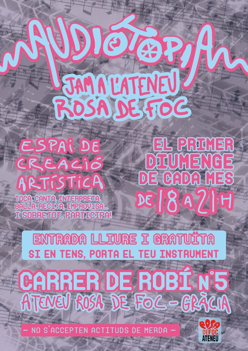 Audiotopia! Espai musical a l'Ateneu Rosa de Foc, cada primer diumenge del mes de 18 a 21 h. Participa a la jam session. Si en tens, porta el teu instrument.