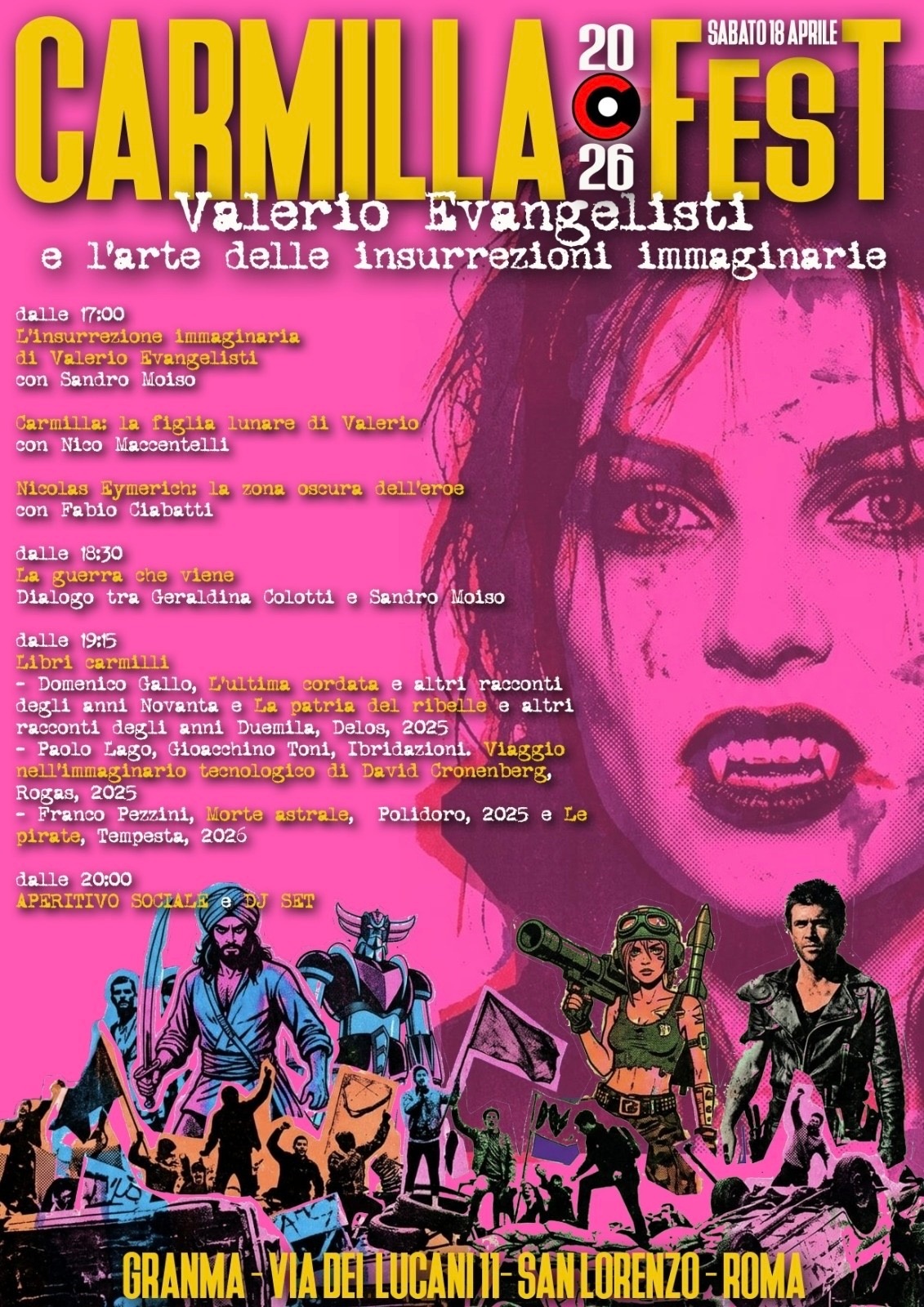 Carmillafest 2026 si terrà a Roma sabato 18 aprile prossimo a partire dalle ore 17.00 puntuali (o come dicono i romani: “vere!”). Il tema è “Valerio Evangelisti e l’arte delle insurrezioni immaginarie”. La location dell’evento è il Granma in via dei Lucani 11 nel quartiere di San Lorenzo.