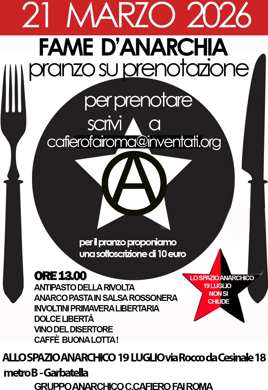 Sabato 21 marzo 2026 a partire dalle ore 13:00 ci sarà il pranzo su prenotazione Fame d’Anarchia allo Spazio anarchico 19 Luglio in via Rocco da Cesinale 18 a garbatella , uno spazio di convivialità, un po' di musica e diffusione di stampa anarchica.
