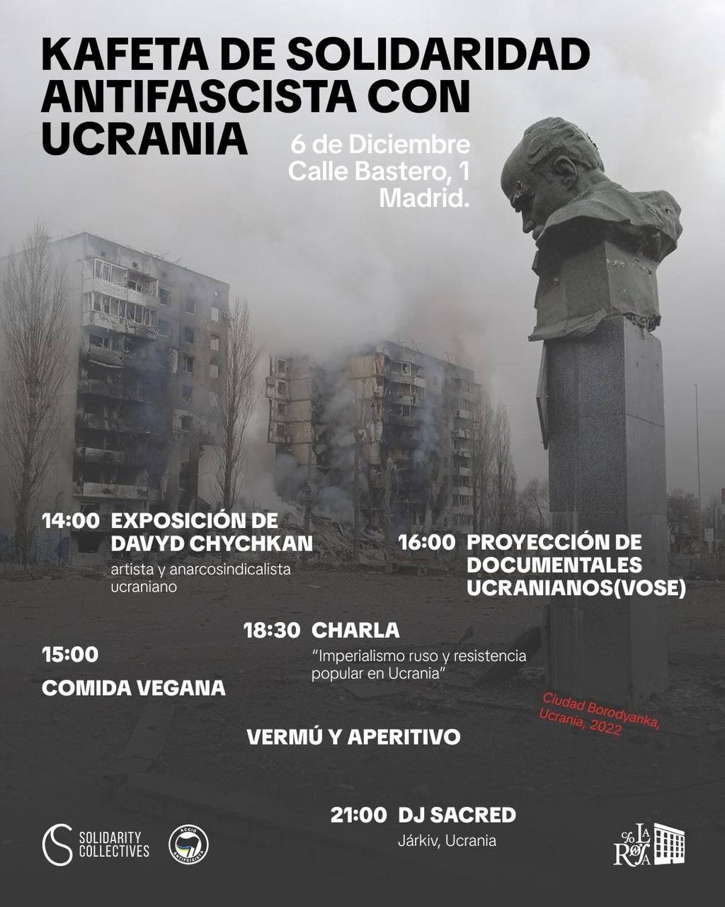 Pásate por La Rosa para escuchar a lxs camaradxs ucranianxs, ver las pinturas políticas del artista Davyd Chychkan y varios cortos documentales. Podrás comprar camisetas y pegatinas, y hacer tus preguntas en la charla.