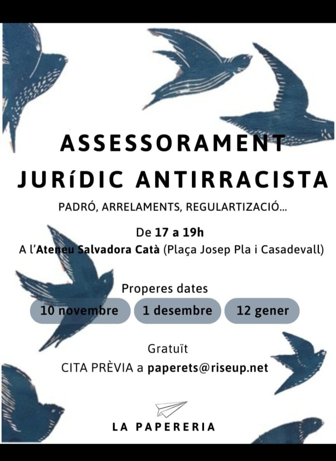 Col•lectiu autogestionat que ofereix assessoria jurídica i acompanyament en temes d'estrangeria respecte a tràmits de regulació de papers per arrelament, reagrupacions familiars, matrimoni/parelles de fet, renovacions, nacionalitat,etc. És un servei mensual gratuït i en formació constant!