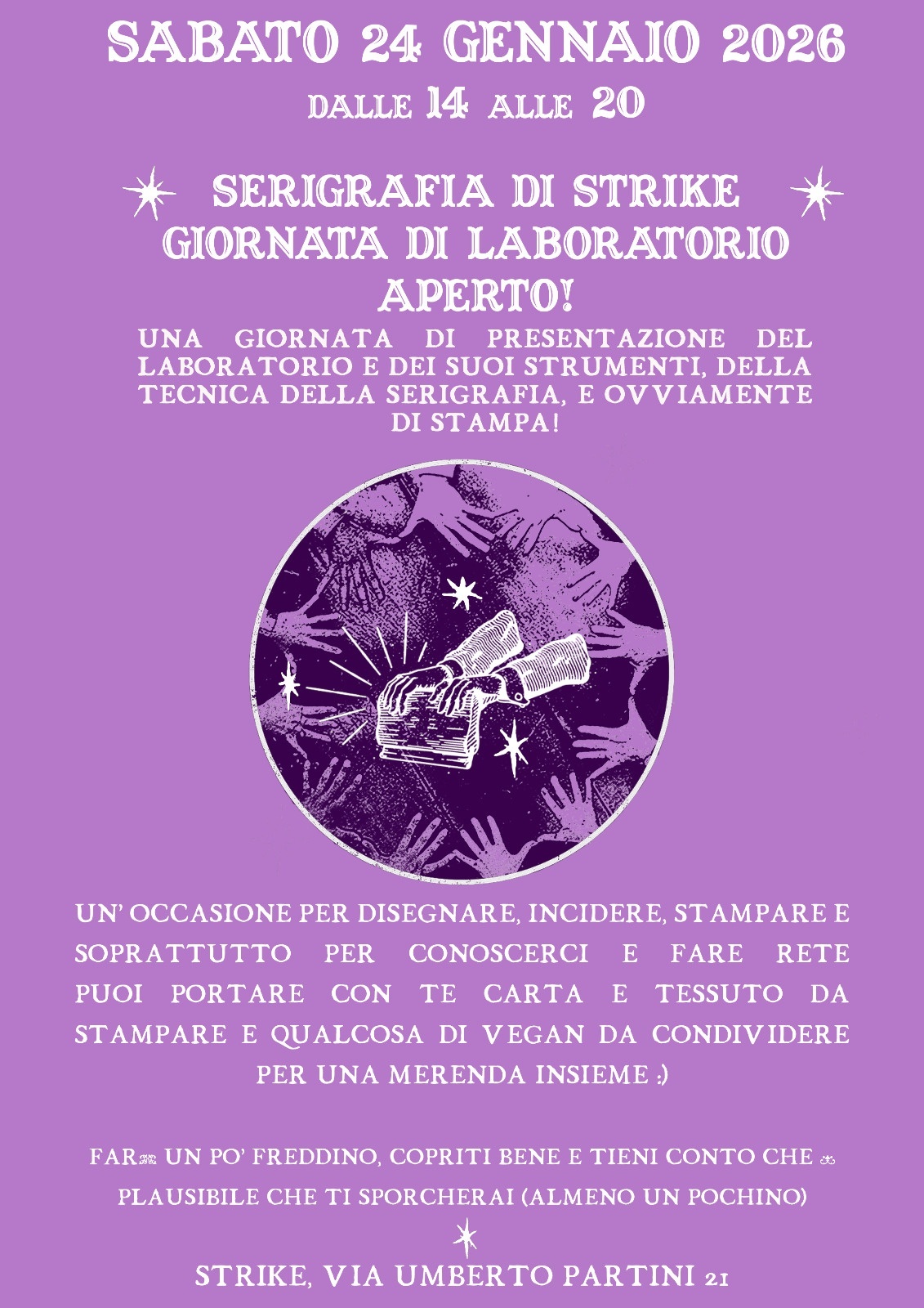 Una giornata di presentazione del laboratorio e dei suoi strumenti, della tecnica della serigrafia e ovviamente di stampa!