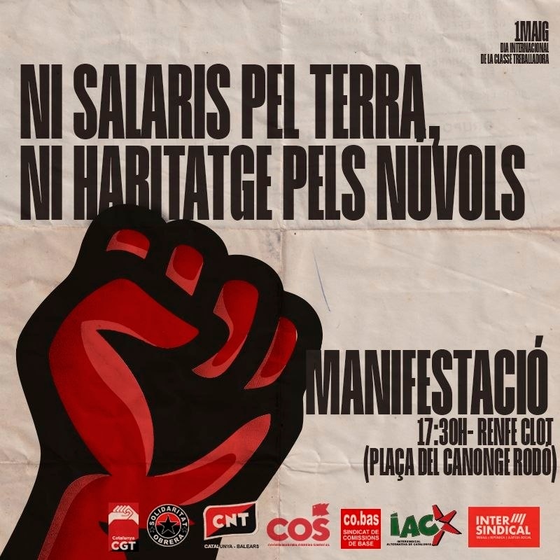 En aquest Primer de Maig, la classe treballadora catalana sortim al carrer amb una urgència clara: el cost de la vida ens asfixia mentre els beneficis empresarials baten rècords històrics. No és una crisi, és un transvasament de riquesa de les nostres mans a les dels rendistes i les grans empreses. Aquestes darreres setmanes es fa evident com, amb l’excusa de la guerra imperialista, és la classe obrera sempre qui surt perdent. Mentre el capitalisme ens ofega aquí, l’imperialisme mata arreu del món. Dues cares d’una mateixa moneda i amb un mateix objectiu: El guany capitalista per sobre de la vida de les persones.