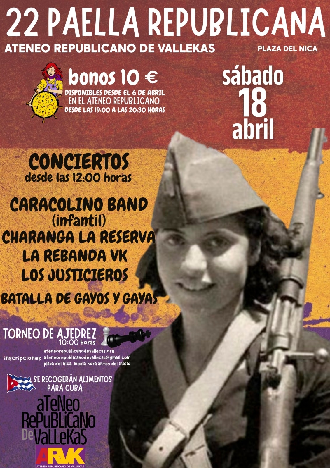 Este año celebramos la 22 Paella Republicana 🥘 de Vallekas. El 18 de abril vente a nuestra histórica Plaza del Nica (Arroyo del Olivar, 79). Compartiremos arroz, alegría barrial, música, animación infantil e intervenciones de colectivos sociales que están en las barricadas reivindicativas.