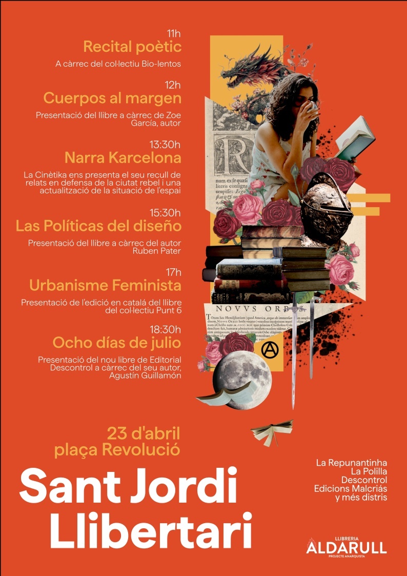 Vine a gaudir de la diada popular que organitzem a la plaça Revolució fora dels circuits oficials i abusius. Reivindiquem junts l'autogestió i prenem el carrer amb una programació ben carregada i moltes distris on trobar tot el que necessites aquest Sant Jordi recolçant projectes anarquistes. I si no, la nostra llibreria de Torrent de l'Olla 72 també estara oberta per si vols venir a visitar-nos com qualsevol dia. Ens veiem pel Sant Jordi Llibertari!