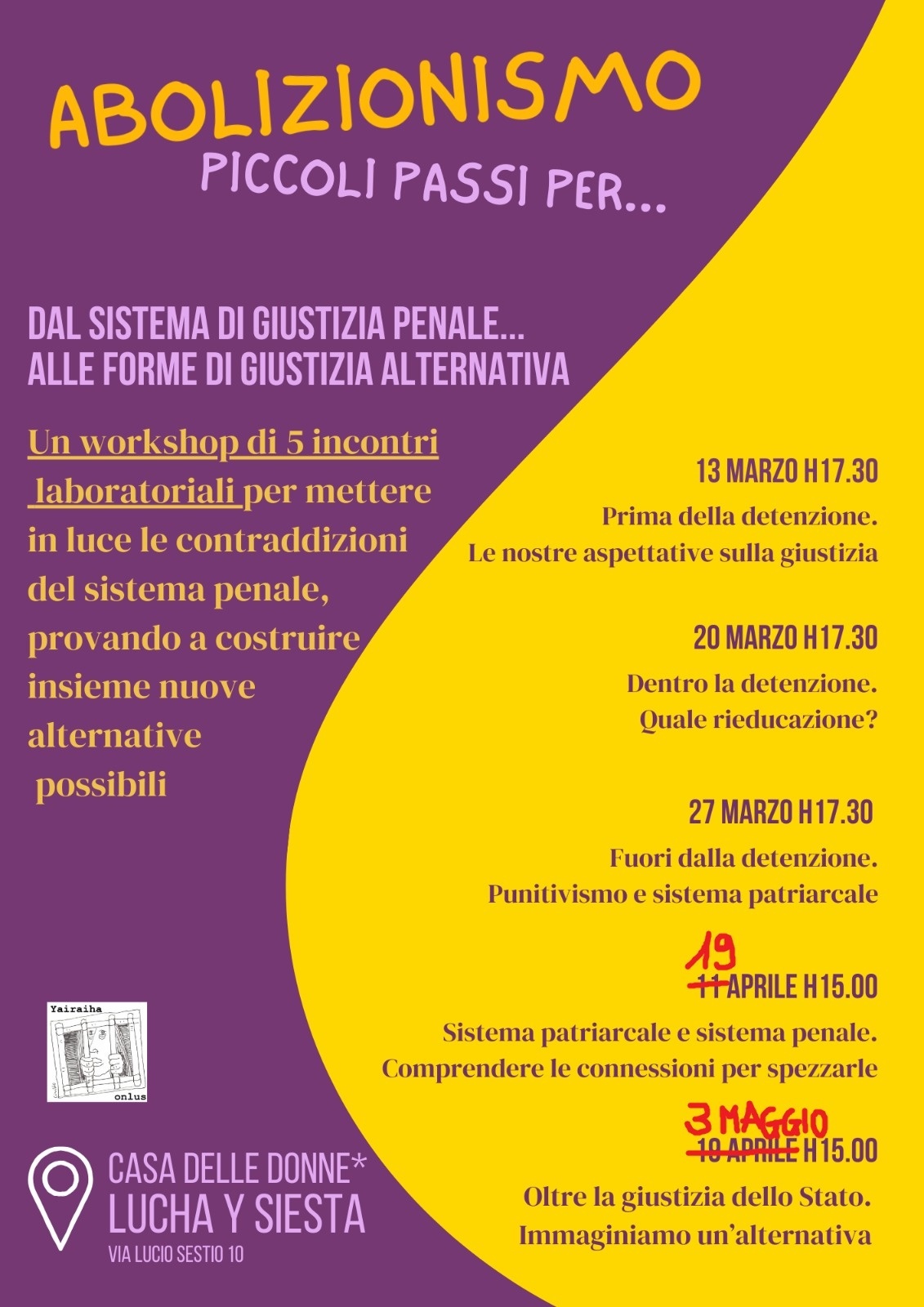 Trovate qua maggiori informazioni e il form per l'iscrizione: https://www.abolizionismopiccolipassiper.com/2026/02/23/workshop-dal-sistema-di-giustizia-penale-alle-forme-di-giustizia-alternativa/