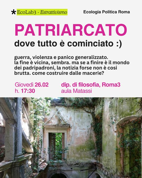 Ecolab3: Patriarcato, dove tutto è cominciato Thursday, Feb 26, 05:30 PM-08:00 PM Thursday 26 February 20:00 Roma3, dipartimento di filosofia, comunicazione e spettacolo, aula Matassi Via Ostiene 234-236 Ecologismoecologia politicatransfemminismo